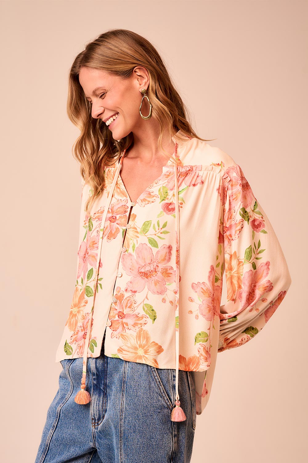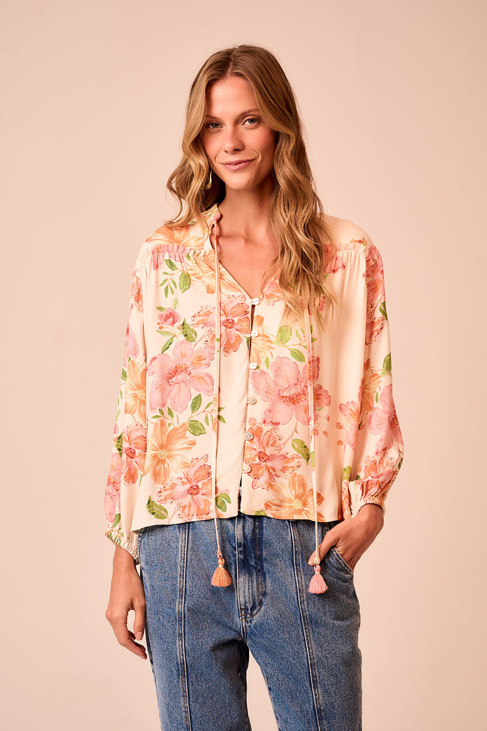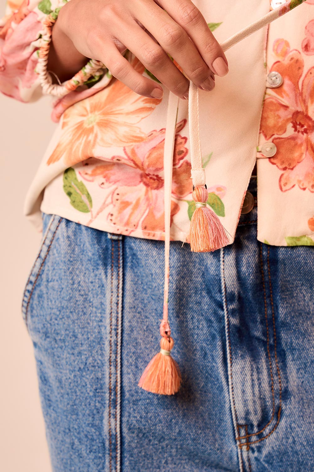 Bata Dolce Vita possui abertura frontal, botões de madrepérola casquinha, gola com lastex e detalhe em cadarço com ponteira personalizada. As mangas com elástico no punho completam o modelo com leveza e detalhe artesanal.