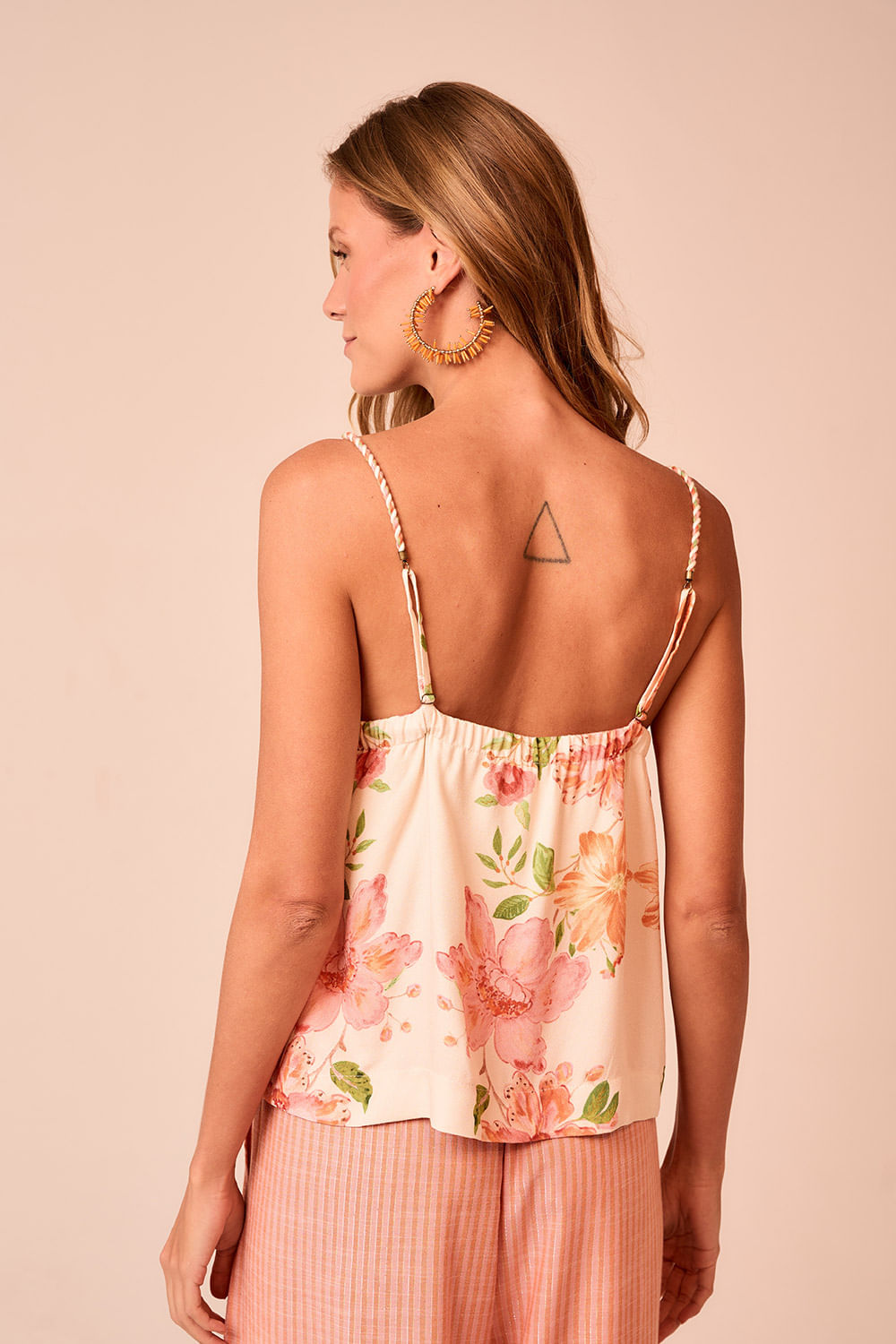 Blusa Dolce Vita possui modelo quadrado e tecido leve. A peça ganha destaque pelas alças artesanais reguláveis e elástico nas costas proporcionando conforto e personalidade. Um toque delicado para dias que pedem suavidade.
