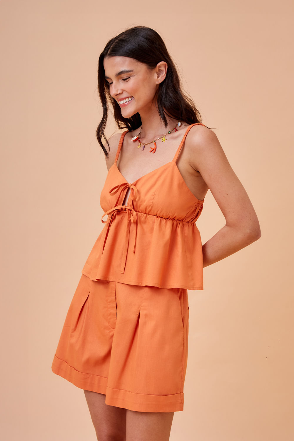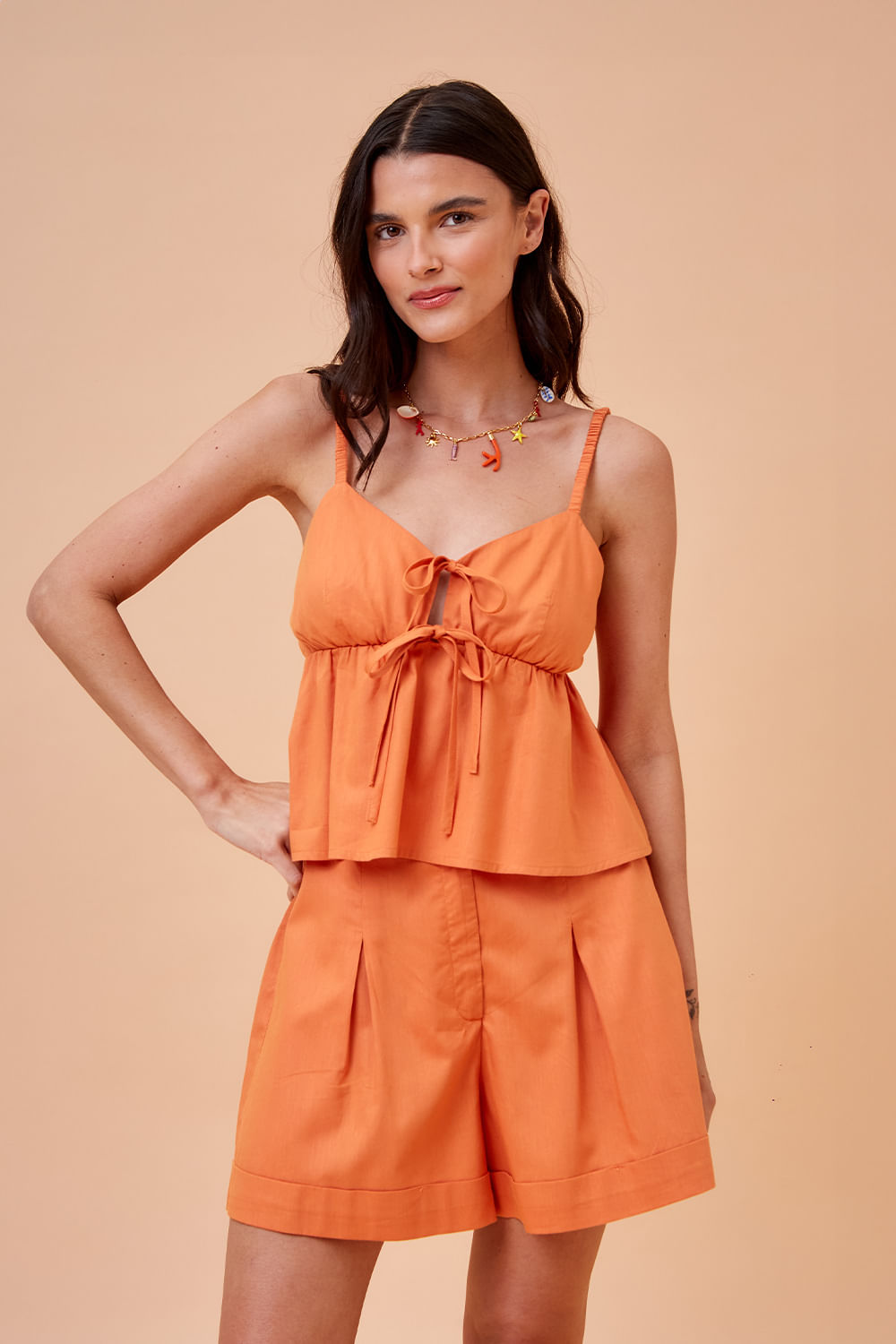 Blusa Porto é leve e se destaca pela amarração dupla na frente e alças em elástico franzido, criando um equilíbrio entre conforto e feminilidade.