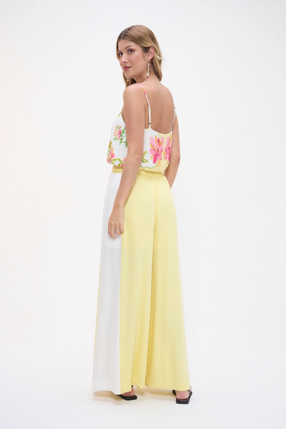 Calça Bicolor Limoncello combina estilo e conforto com cós largo em elástico, oferecendo ajuste perfeito e liberdade de movimento. Versátil, pode ser usada em diferentes ocasiões do dia.