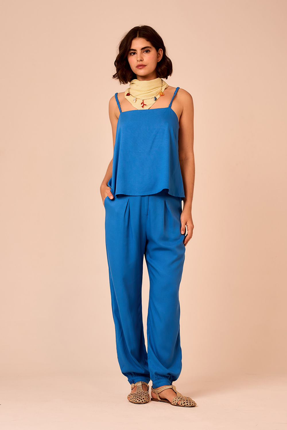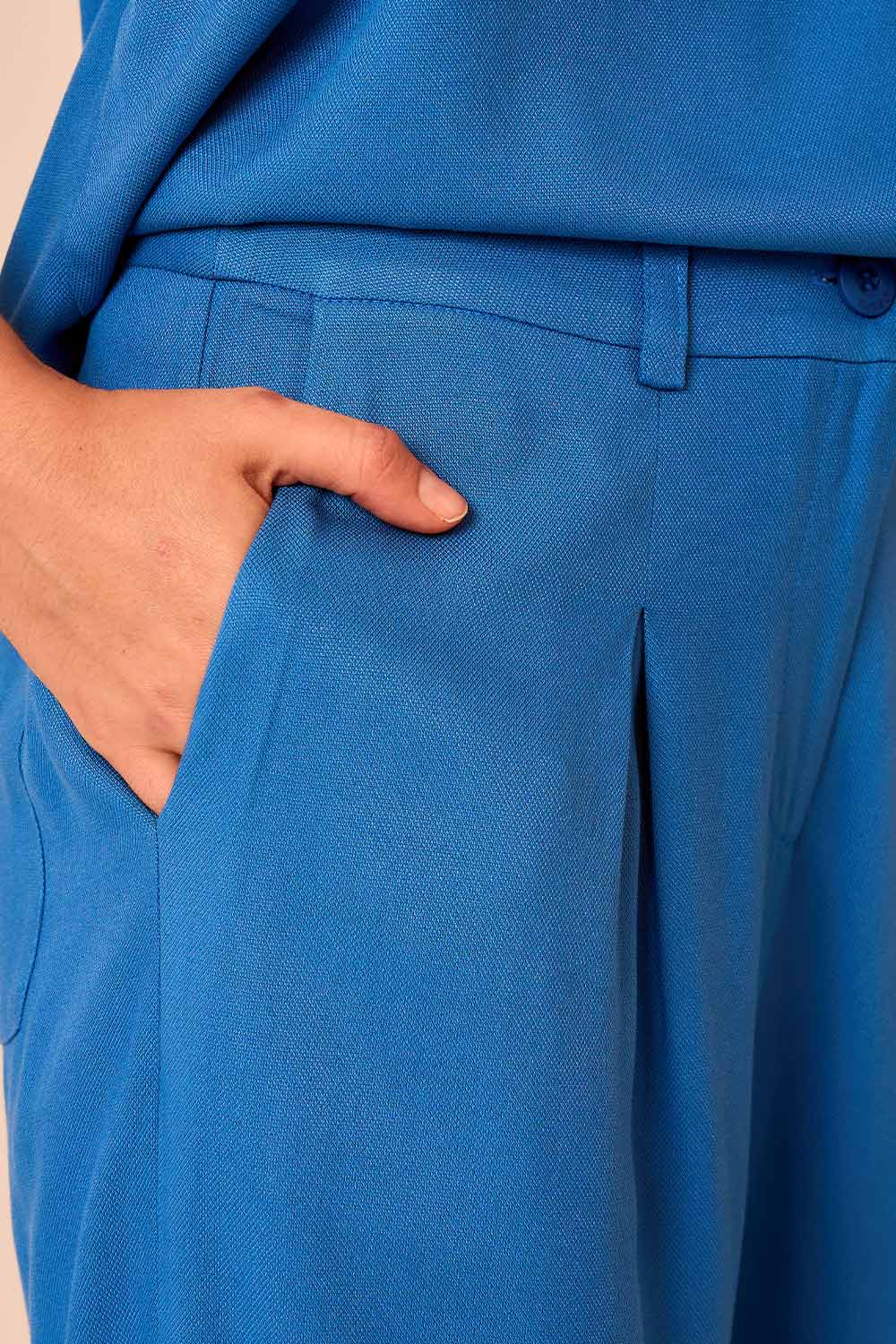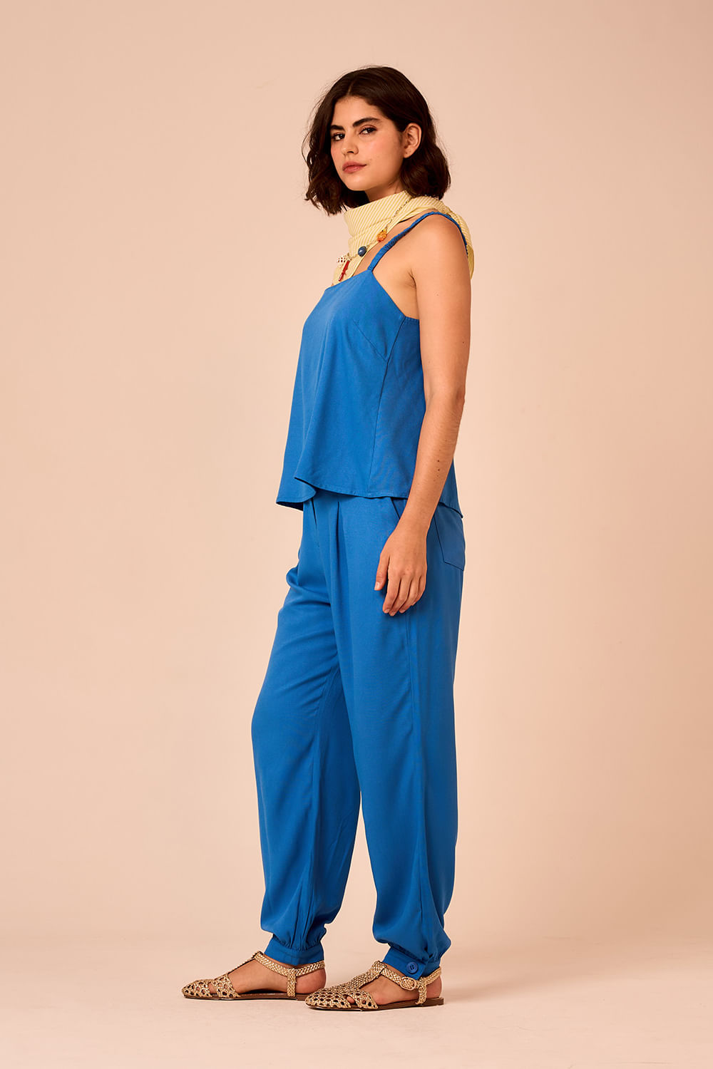 Calça Celeste com modelagem cenoura dá leve sofisticação à peça, que recebe pregas frontais e passadores para cinto. Os botões no tornozelo finalizam o modelo com toque diferenciado.