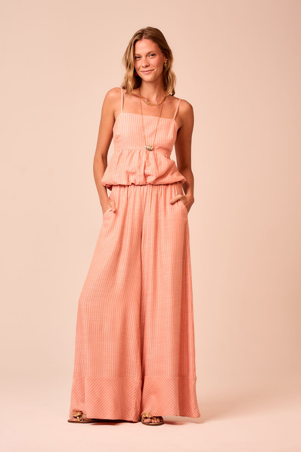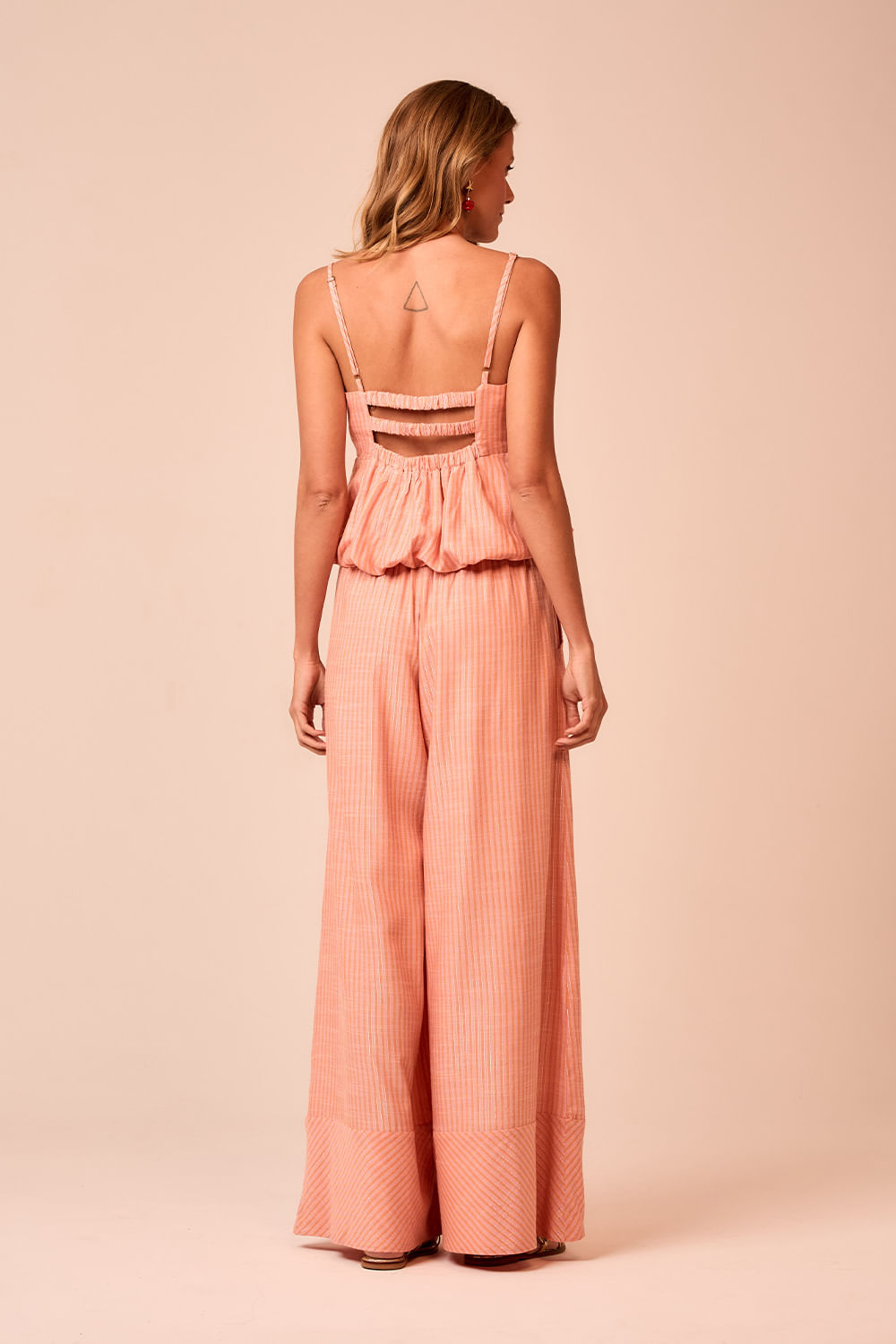 Calça Petala possui leve brilho do lurex e listras diagonais na barra sobreposta dando identidade a essa calça pantalona com elástico na cintura. Um modelo que combina elegância, movimento e conforto para atravessar os dias com estilo.