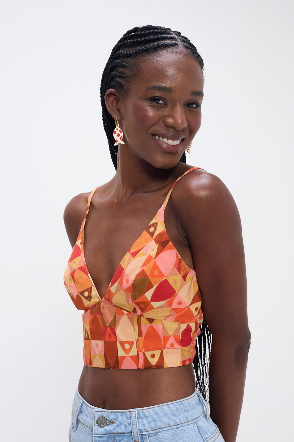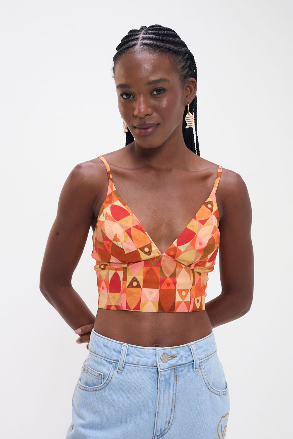 Top Pescare possui decote em V valorizando o busto com recortes delicados, enquanto o lastex nas costas garante ajuste confortável. Leve e versátil, é ideal para compor looks do dia ou sobreposições.