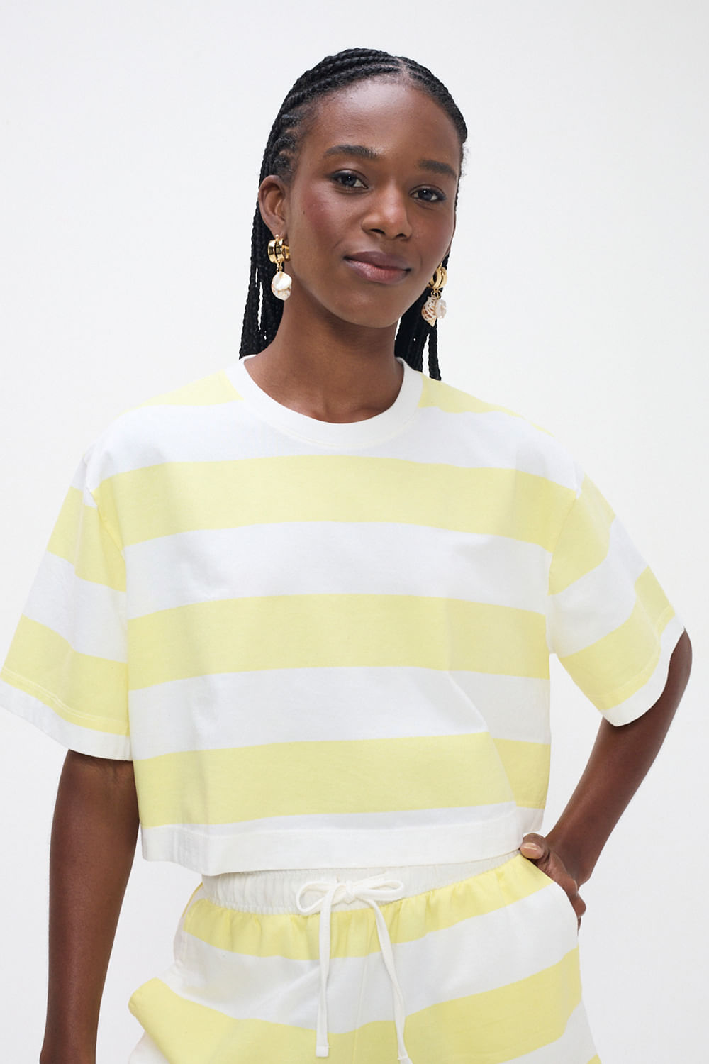 Tshirt Listras Limoncello é leve e descontraída, perfeita para looks casuais. O decote careca e a modelagem fluida valorizam o corpo com conforto, mantendo o toque moderno da peça.