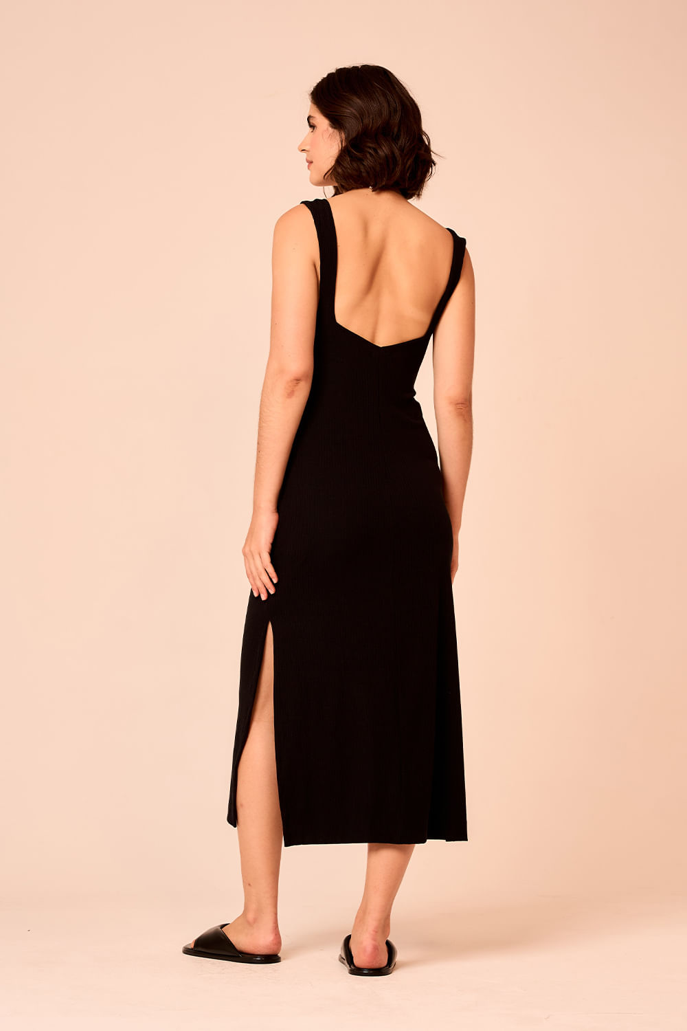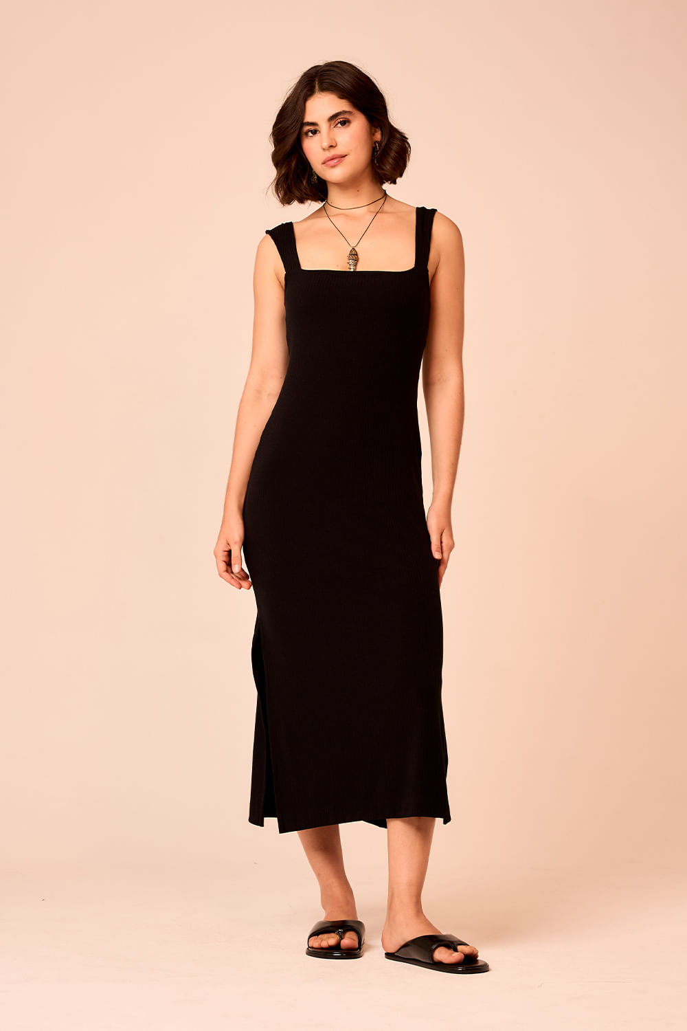 Vestido Canelado Decote Quadrado vem em malha canelada realçando a silhueta com decote quadrado e alças largas. As fendas laterais acrescentam movimento, criando um visual que transita facilmente entre o dia e a noite.