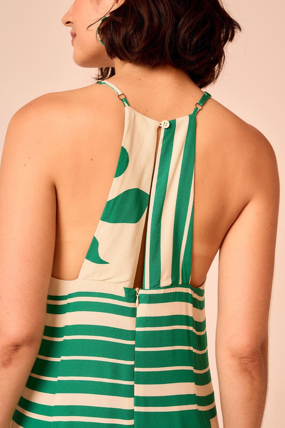 Vestido Cropped Al Mare possui fendas laterais que trazem fluidez ao caminhar, enquanto as alças reguláveis e o zíper invisível nas costas garantem ajuste delicado ao corpo.