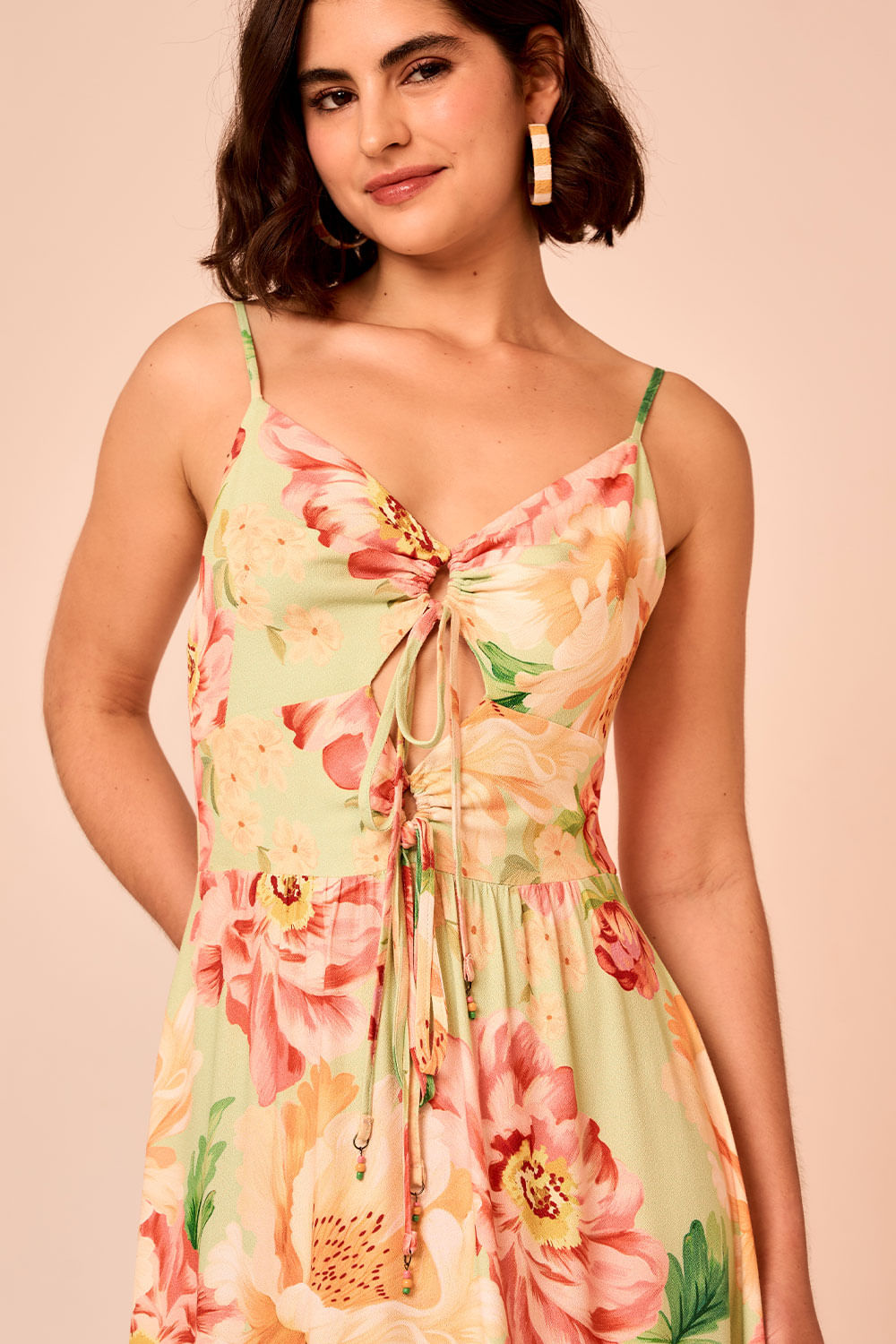 Vestido Cropped Floral Napoli possui busto tipo corselet, com recortes e amarrações finalizadas por ponteiras, alças ajustáveis e lastex nas costas. Um modelo que traduz delicadeza em equilíbrio.