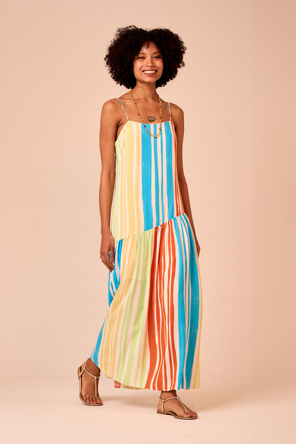 Vestido Cropped Trópicos possui barra levemente assimétrica em maria, alças em amarração com ponteiras e o zíper invisível nas costas completam o modelo delicado.