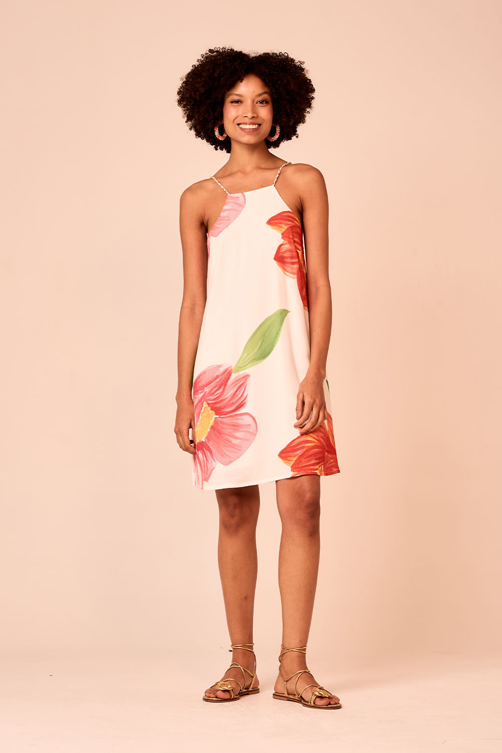 Vestido Curto Belle possui alças em corda trançada com as cores da estampa, trazendo autenticidade ao vestido curto. A regulagem em amarração complementa o modelo leve e fresco.