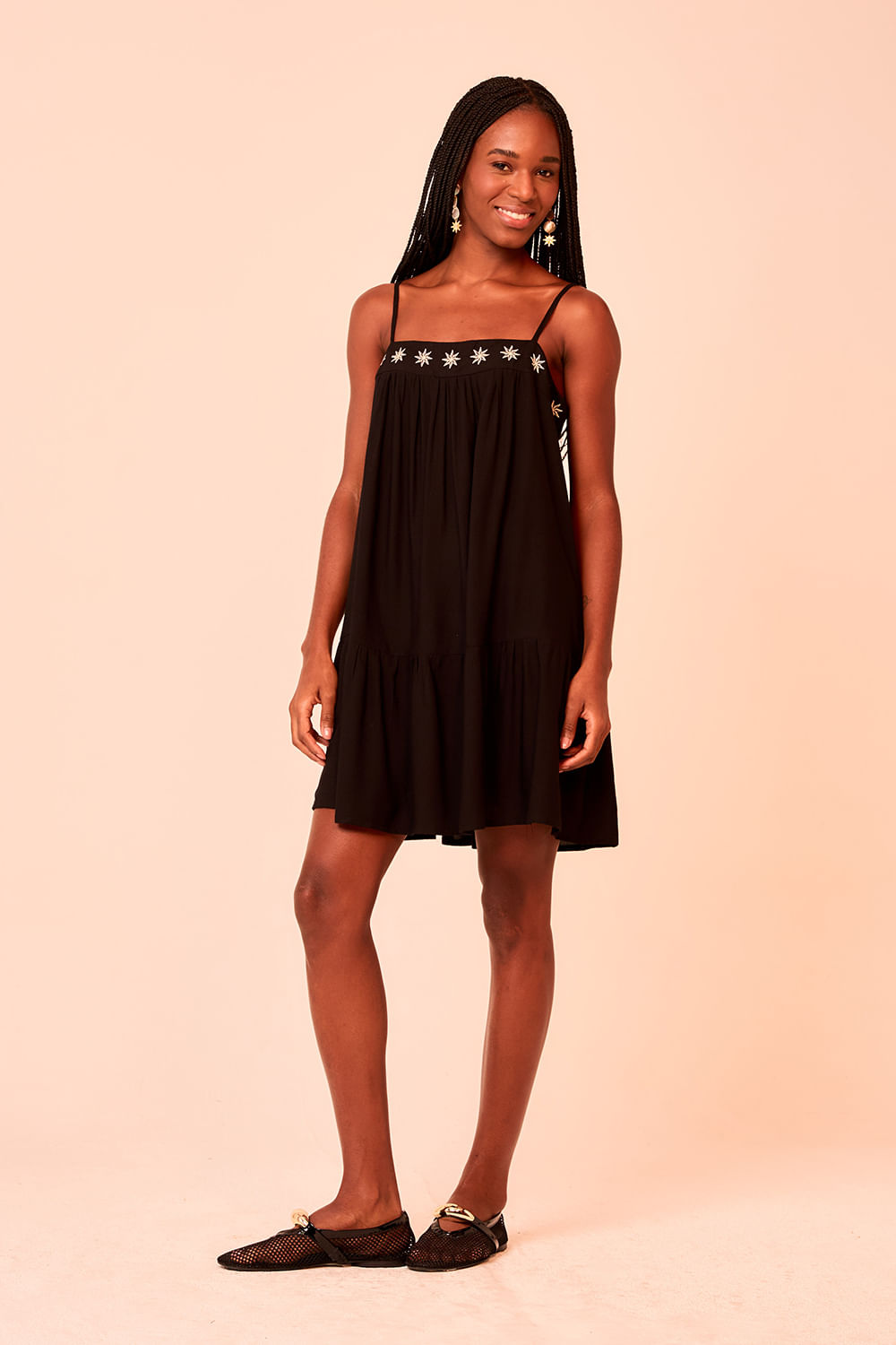 Vestido Curto Bordado Estrela - Preto