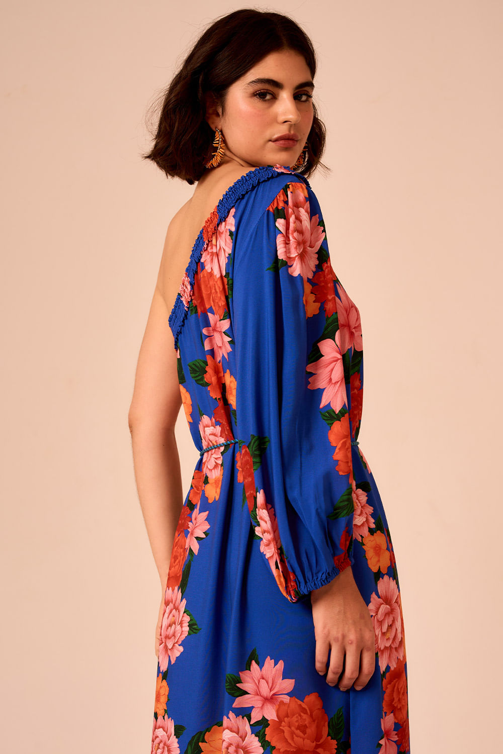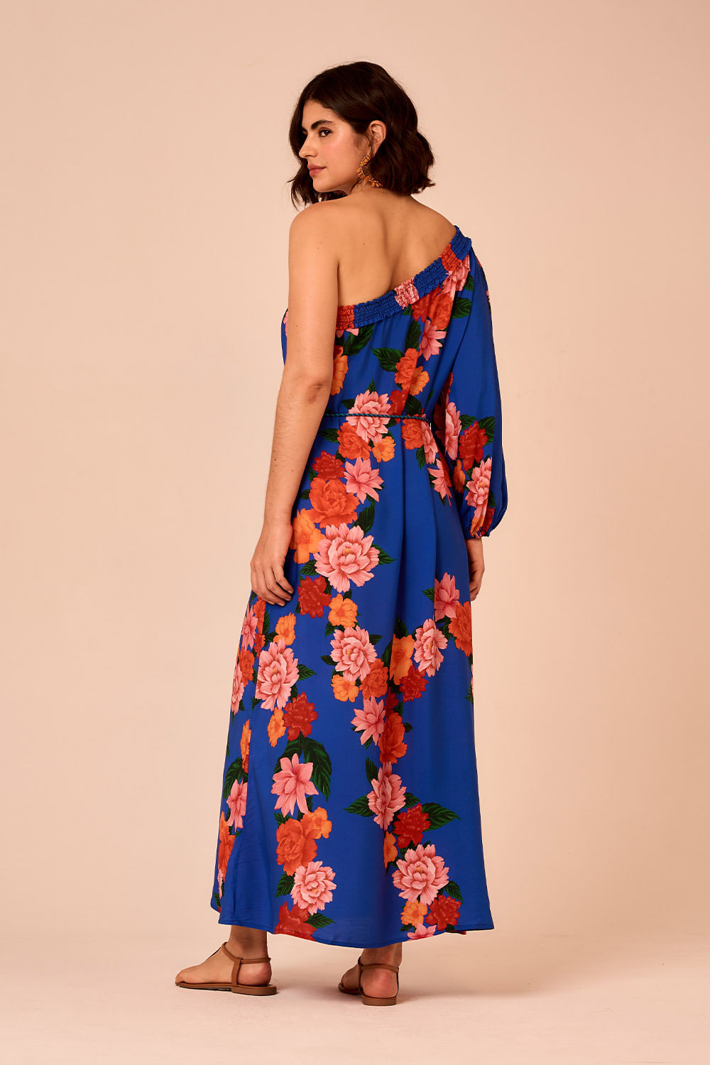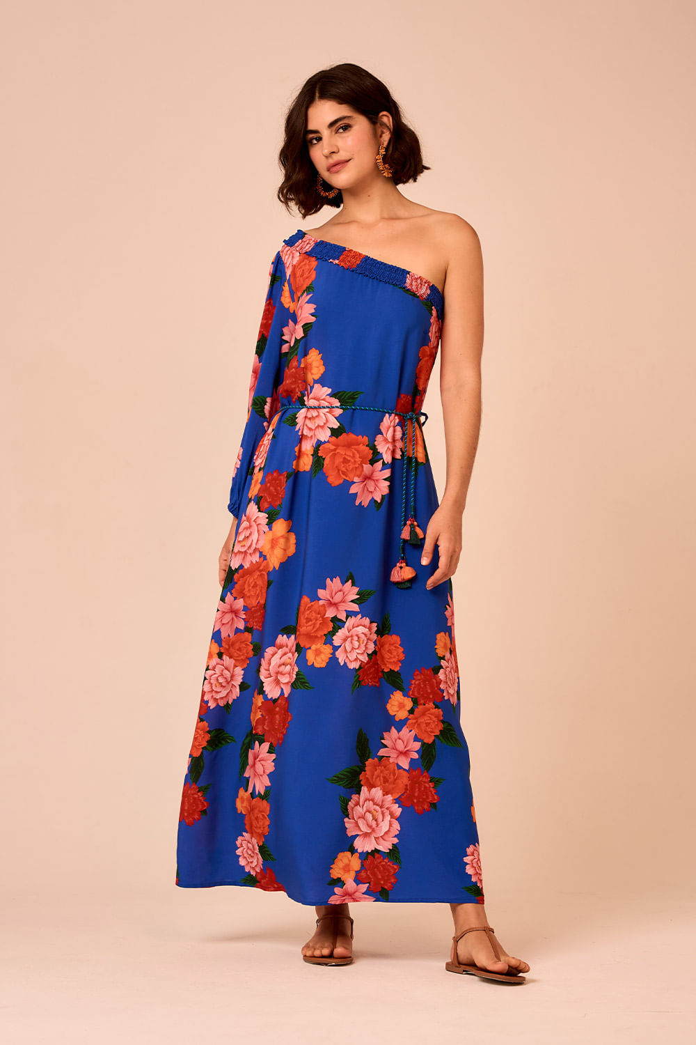 Vestido Um Ombro Só Jardim Verona possui modelagem de um ombro só e acabamento em elástico no busto e ombro. O cinto de corda completa a peça, trazendo um toque artesanal à silhueta fluida.